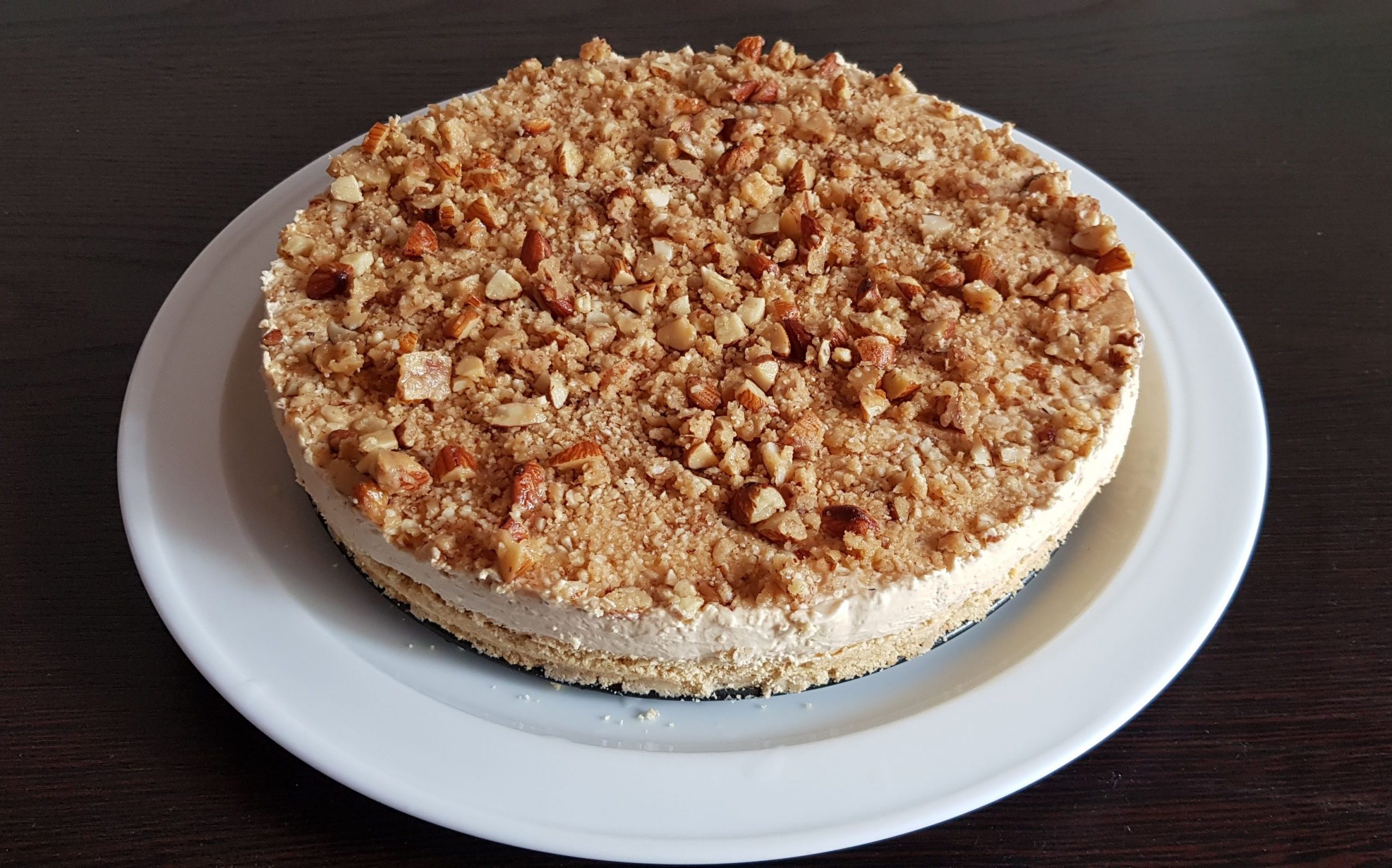 - Decorate the cheesecake with almond brittle and some caramel sauce. 😋